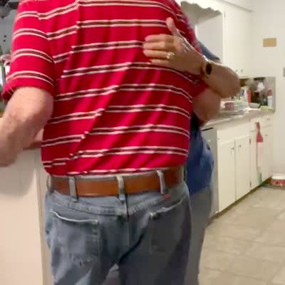 A senior man and senior woman sing and dance in a kitchen. Then a black Labrador retriever dog walks over to them and coughs loudly.