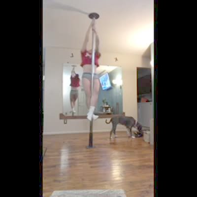 A woman dances and spins on a stripper pole. The pole falls over and she lands on top of her dog. Music rights not cleared.