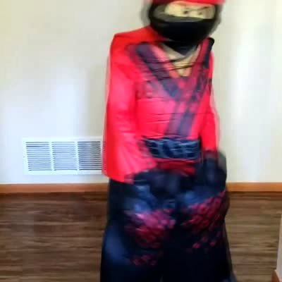 A young boy dances to music in a Ninja LEGO costume in a kitchen and at the end a large dog walks between his legs and trips him over and he falls down.