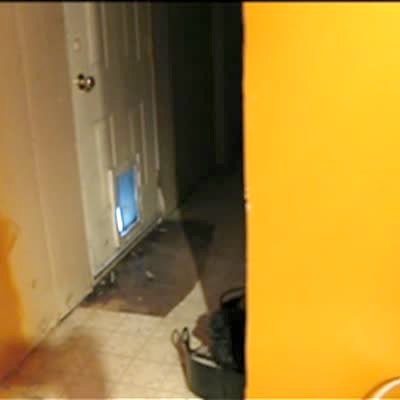 A man shows an Australian Shepherd the mess of trash he made, and the dog walks through a doggy door in and out of the house every time he sees the trash.