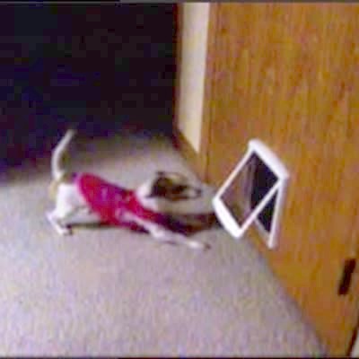 Small terrier dog waits outside doggy door until a cat jumps through the opening & tries to attack the dog.