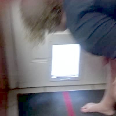 "Disappearing Doggie Door" Woman removed the glass from a door to clean it. she walks through the opening in the door along with one dog, but her other dog will not go through the opening until the door frame is open.