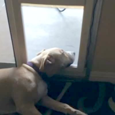 A dog lays with its head out of an automatic doggy door. The door repeatedly tries to close on the dog and opening back up when it hits the dog's head.