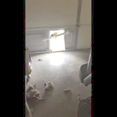 The man with the camera shows a mess in the living room and kitchen after the garbage cans got emptied. The man calls a dog into the house and the dog walks in through the doggy door. It sees the mess and walks right back out the door. The man calls the dog back and the same thing happens. Another clip plays and the dog lays on the floor and looks away from the man while he questions it about the mess.