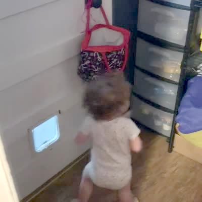 A seven month old girl blocks dog from coming in through doggy door. Dog finally gets through and goes between tot's legs. Caucasian.