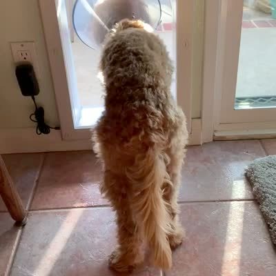A Doodle dog stands halfway through an automatic doggy door with a cone on her head post-surgery. The door repeatedly hits the dogs back until she eventually walks away.