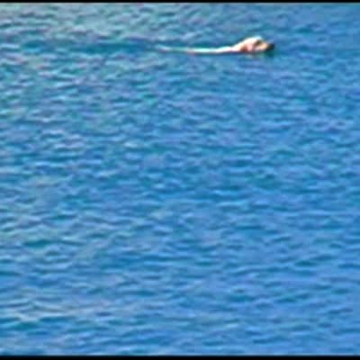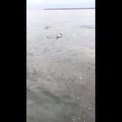 Dog swims after a dolphin in the ocean and the dolphin smacks its tail against the water & splashes dog.