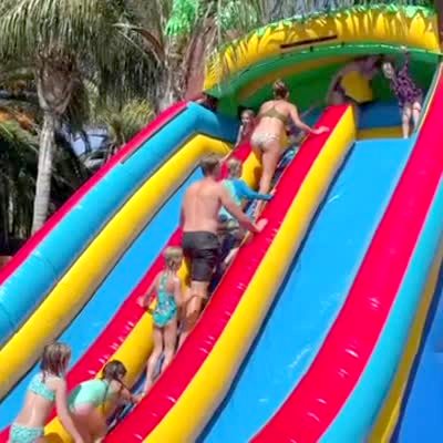 A man falls when he climbs an inflatable slide ladder, and knocks over a line of young boys and girls behind him.