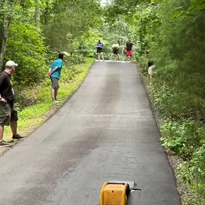 A woman rolls a watermelon down a hill, then it explodes in a man's face and he falls down into trees on the side of the road.