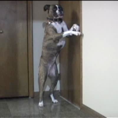 Large boxer dog stands on its hind legs and opens a door with its paw. Then it walks out.
