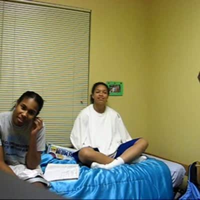 3 girls in college dorm room pretend there's a giant spider on the bed. Girl under the bed sticks her hand up & scares teen boy looking for the spider. Practical joke.