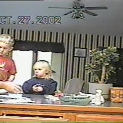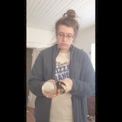A young woman nervously peels paper off a can of biscuit dough, waiting for it to explode. Her dad shouts to scare her and she jumps and throws paper at him before the dough explodes in her hand and she screams.