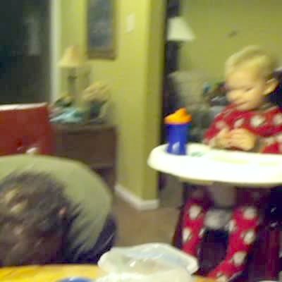 A tot boy sits in a high chair next to his grandpa and grandma. The tot boy rolls a can of Playdoh around on his high chair tray. It rolls off the tray and lands on his grandpa's foot off camera. play dough. Dad.