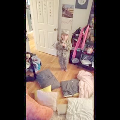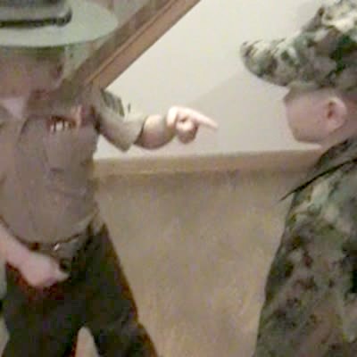 Little boy dressed as drill instructor yells gibberish at little brother dressed as soldier in living room.
