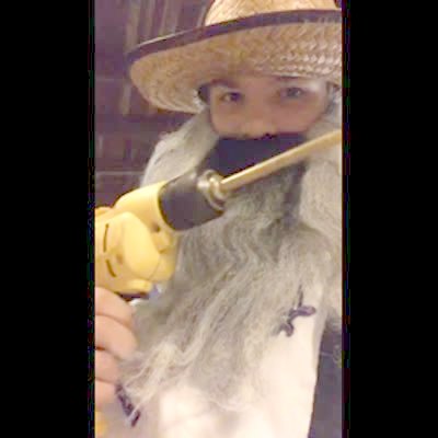A teen boy in a Halloween costume plays with a power drill and the drill whips off his fake beard indoors.