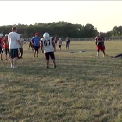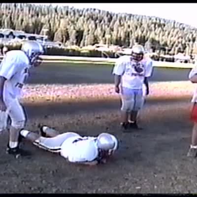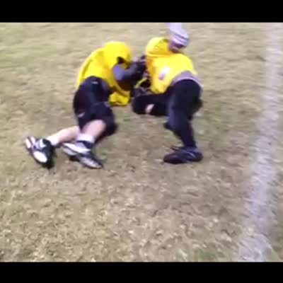 Two boys play pee wee football together, doing a tackling drill. They get their face masks stuck together and fall down on their field.