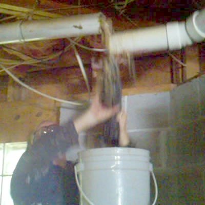 A senior man indoors drills a pipe in a basement. The pipe breaks, leaking sewage.