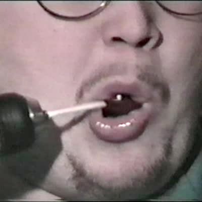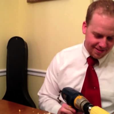 Man shows HUGE drill and talks about how manly he is. The drill bit falls off and makes a huge noise. He laughs.