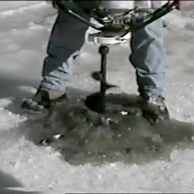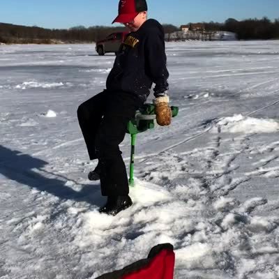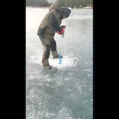 A man drills a hole into a frozen winter icy lake to ice fish. The end of the drill snaps off and falls through the hole.
