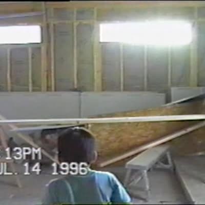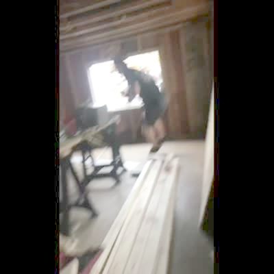 A man enters a house under construction with a drill gun and pretends to be in a battle then he jumps over a pile of tools and he trips and falls down.