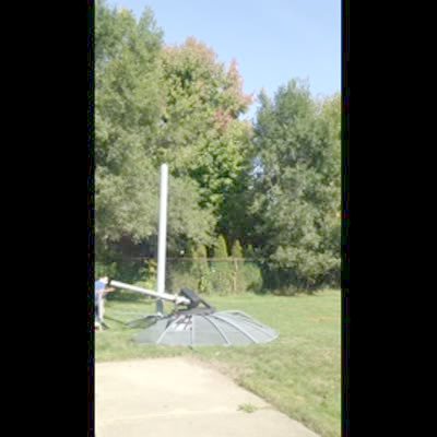 A man stands on a ladder and drills into a satellite dish outdoors when the satellite dish collapses and crashes into his ladder, knocking him and the ladder onto the ground before the man says "I knew that was going to happen."
