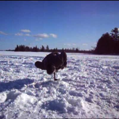 Man spins around while laying on top of an ice drill implanted in the snow & ice.