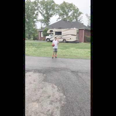 A teen boy does a basketball dribble drill in the driveway. After repeatedly messing it up he gets so mad that he kicks the ball and it hits a light on the house and breaks the glass.