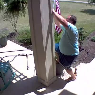 A man stands on a planter to hang an American flag on his front porch but the planter topples over and the man falls down the steps, landing on a drill tool and he rolls on his back onto the walkway. Security footage.