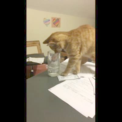 Small brown kitten climbs beer mug/ glass and sticks body in to drink water at the bottom. cute