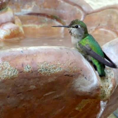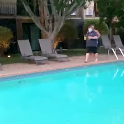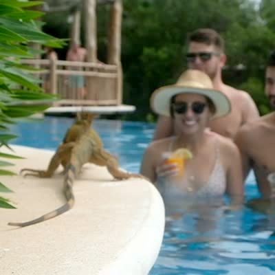 An iguana jumps off a ledge onto a woman's arm in a pool. She screams and a man pushes it off of her arm. Slow motion.