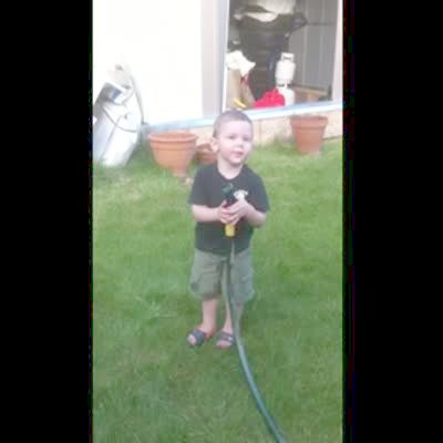 A young boy attempts to drink from a hose outside and sprays himself in the face.