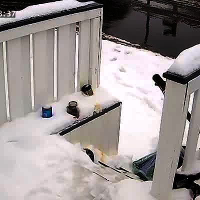 A woman slips and falls down a snow covered flight of stairs as she leaves the house with a cup of coffee, and she does not drop the coffee. Security footage.