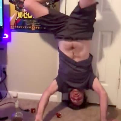 A man does a hand stand against a wall at home, but he gets the waistband of his shorts stuck on the doorknob.
