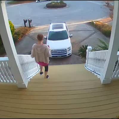A woman slips and falls down a flight of stairs on a front balcony. Security footage.