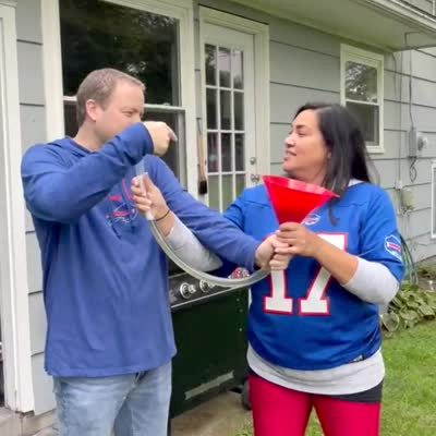 A woman holds out a funnel so a man can drink beer out of it in a backyard. He lifts the funnel above his head and the beer spills all over his head.
