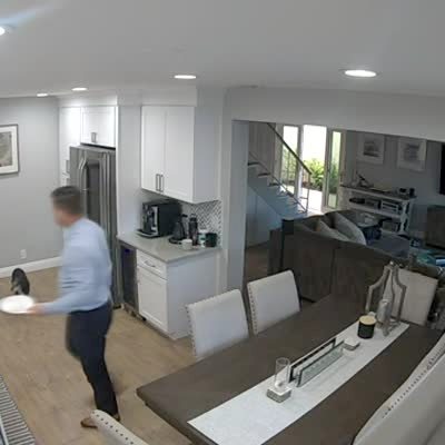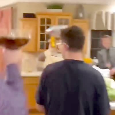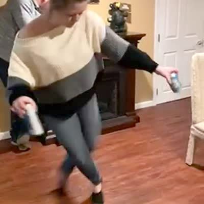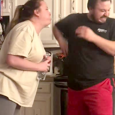 When a woman opens a can of Kombucha drink in a kitchen, the can explodes towards her husband as he puts away trash. Security footage.