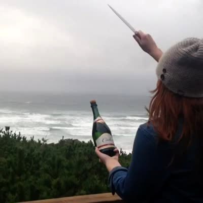 A woman on a balcony tries to open a bottle of champagne with a knife but drops the bottle several stories.