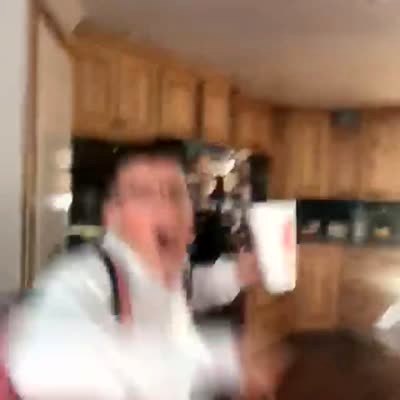 A teen boy sings "Macho Macho Man" as he carries a large drink into a kitchen. He places it on the counter, then climbs up onto the counter and knocks it over.