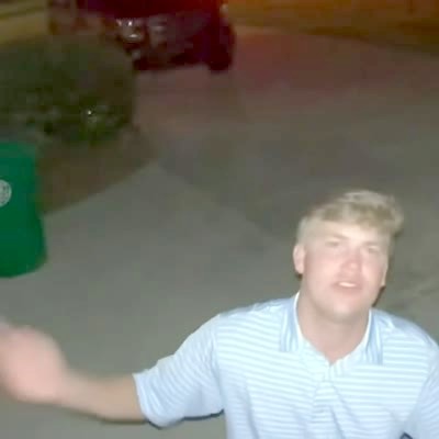 A drunk young man in a driveway talks to the security camera and tells his parents that he knows he's busted for being out late drinking but says they can't do anything because they're in the Bahamas. Security footage.