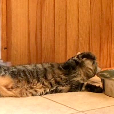 A lazy cat lies next to a water dish on the floor, dips its paw in it repeatedly, and licks its paw indoors.