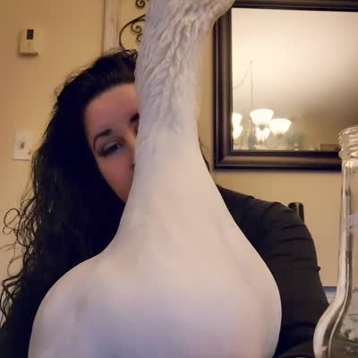 A woman holds a large goose. Anytime the woman starts to talk, the goose loudly squawks.