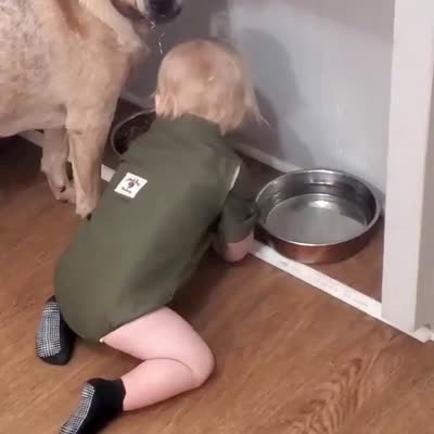 A young girl attempts to drink water from a plastic bottle before she gets ran over by her pet dog.