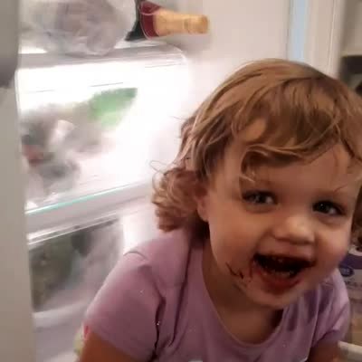 A young girl drinks from a chocolate syrup bottle as she sits in the refrigerator, and her mom catches her.