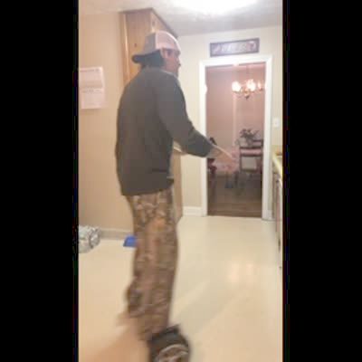 A man falls in the kitchen while he dances to a rap song as he rides a hoverboard while drunk.