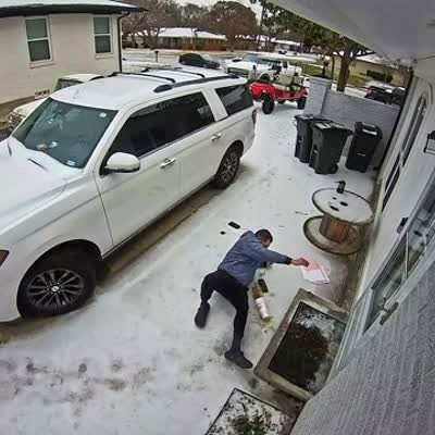 A man slowly walks up an icy path to his house with drinks in his hand. He falls and slides down the driveway. Security footage.