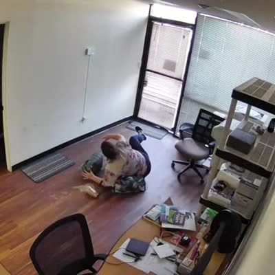 A woman walks into a room and her foot gets caught in the blinds and she trips and falls and spills her coffee. Security footage.
