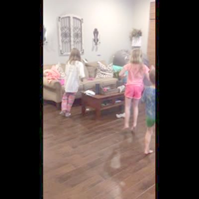 A man flies a drone around his house. His two young daughters and young son chase after it, scream and laugh. It gets caught in one of the girl's hair. She begins to cry.