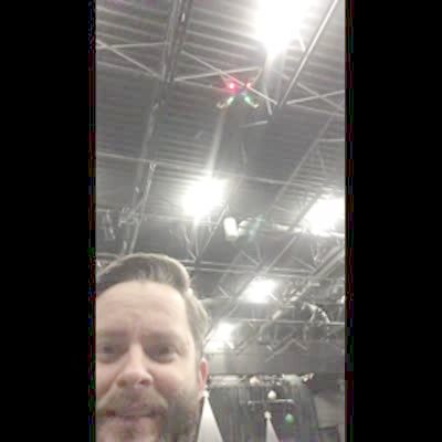 A man films himself while a drone flies above him until it crashes on to his head in an auditorium.