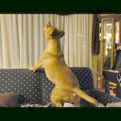 A dog chases a drone in the living room and he jumps off the couch and hits the window.