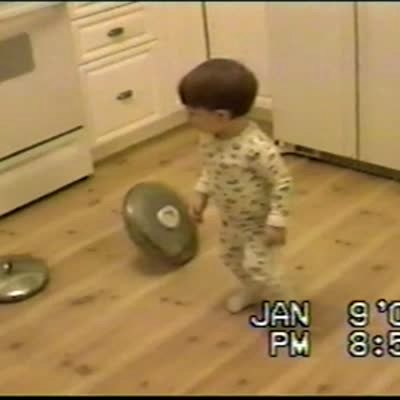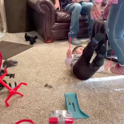 Boy & girl say they're going to play a song. Boy walks over to drum kit, trips & falls into the drums causing big crash sound. Performance problem.